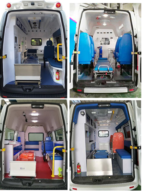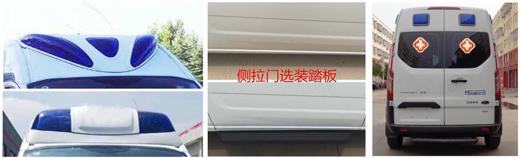 该车配备医疗器械柜,氧气瓶,担架,消毒灯救护专用设备。选装左侧右侧以及前面报闪灯,选装顶部换气扇,选装侧拉门踏板,选装前窗上部报警器时整车高(mm);2407;选装不同风格的警灯.ABS系统控制器型号:EV5051,生产厂:博世汽车部件(苏州)有限公司,选用轮胎:215/75R16LT,层级:8PR,10PR,12PR。