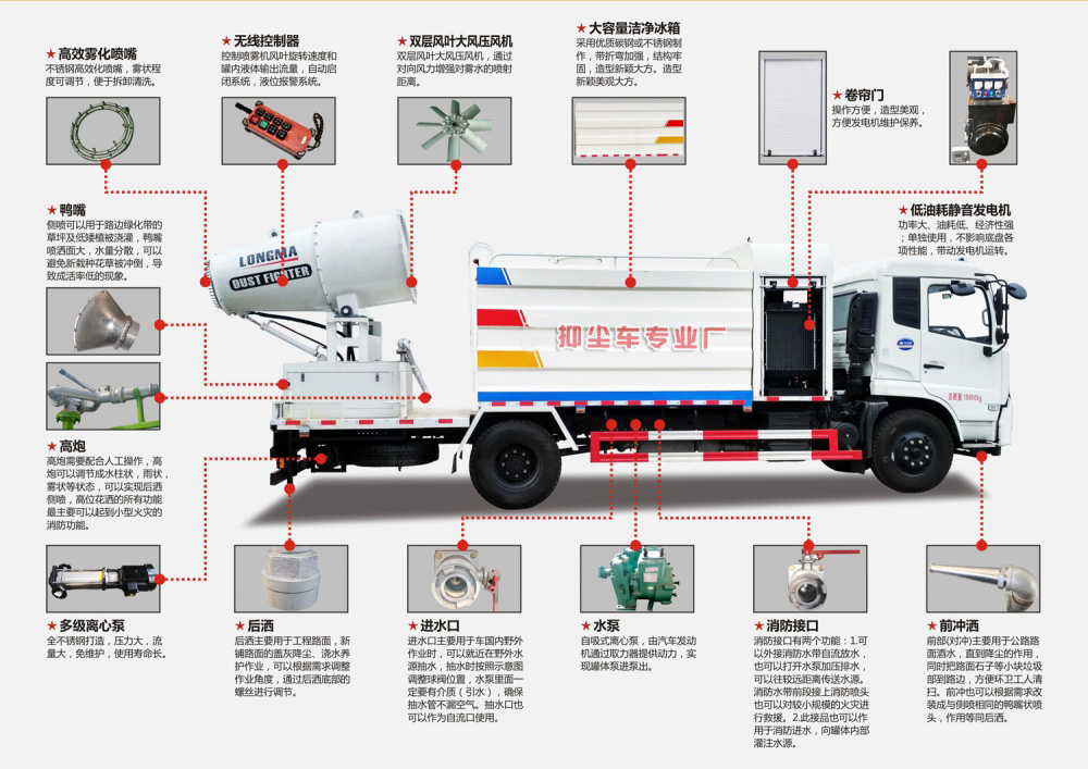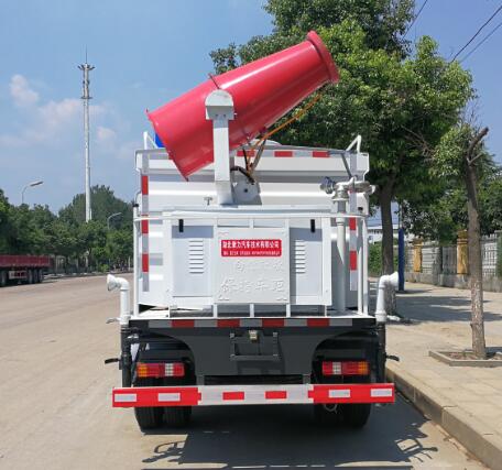 喷雾抑尘车随车装配大功率柴油机、三相交流同步发电机、三相异步电动机、三缸活塞泵,并安装风机风炮,为农药喷洒提供专一动力来源和专用设备。洒水泵可抽水排水,安装滤网,带消防接口,可通过消防栓进水,带自流阀,随车选装20米喷药绿化卷盘